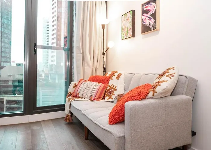 Cosy Modern 2Br Home In The Heart Of Melbourne Cbd apartment offers an equipped kitchen along with an oven and a dishwasher for your convenience. The closest bus stop is A'Beckett Street/Queen Street, which is nearly a 5-minute walk away.